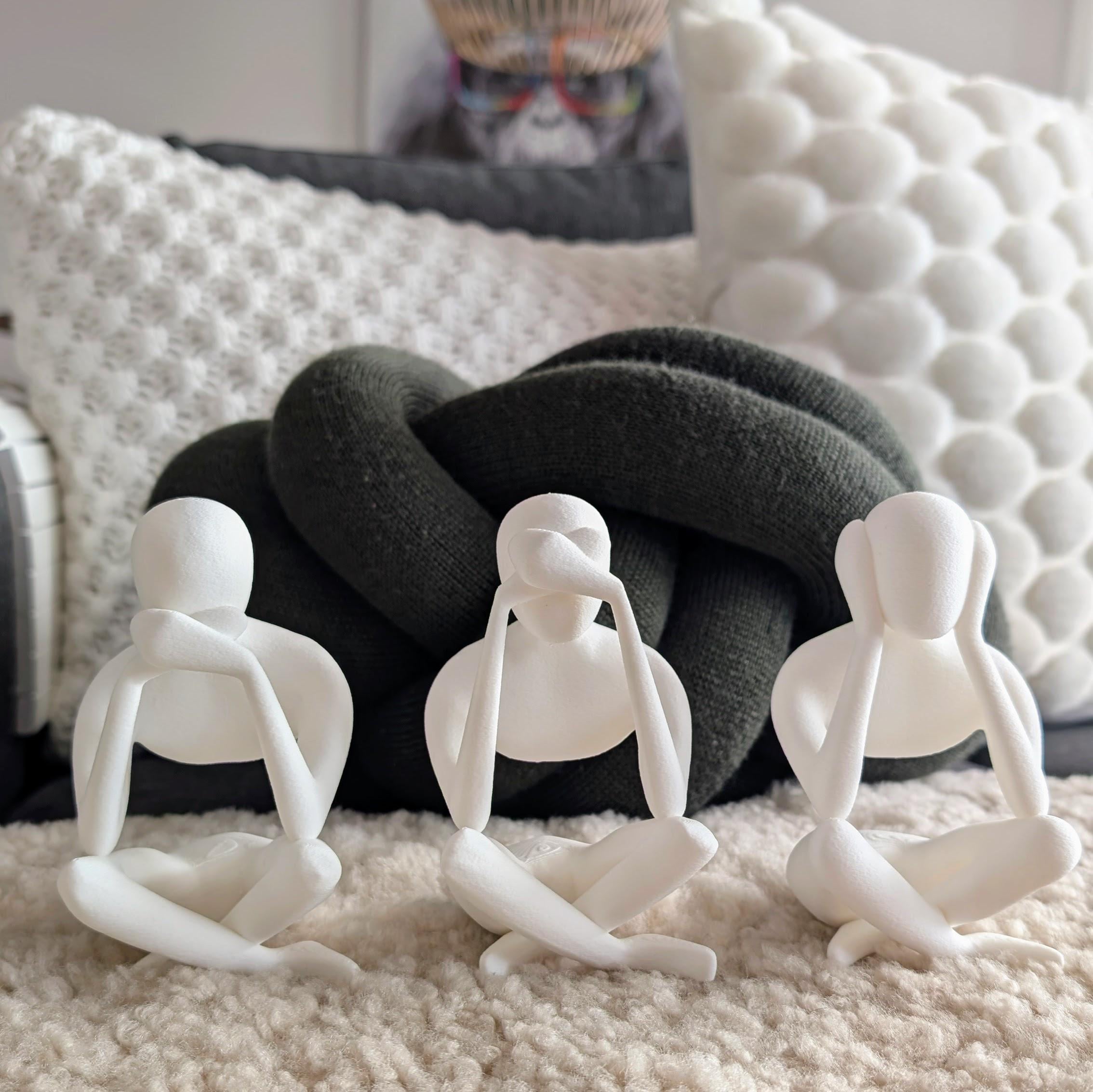 Speak No Evil: The third figure thoughtfully places a hand over its mouth, signifying the importance of mindful and kind communication.