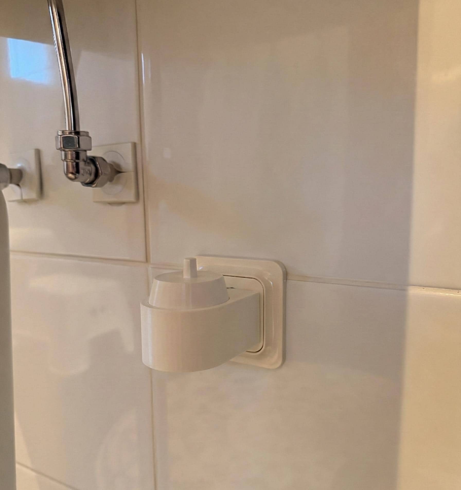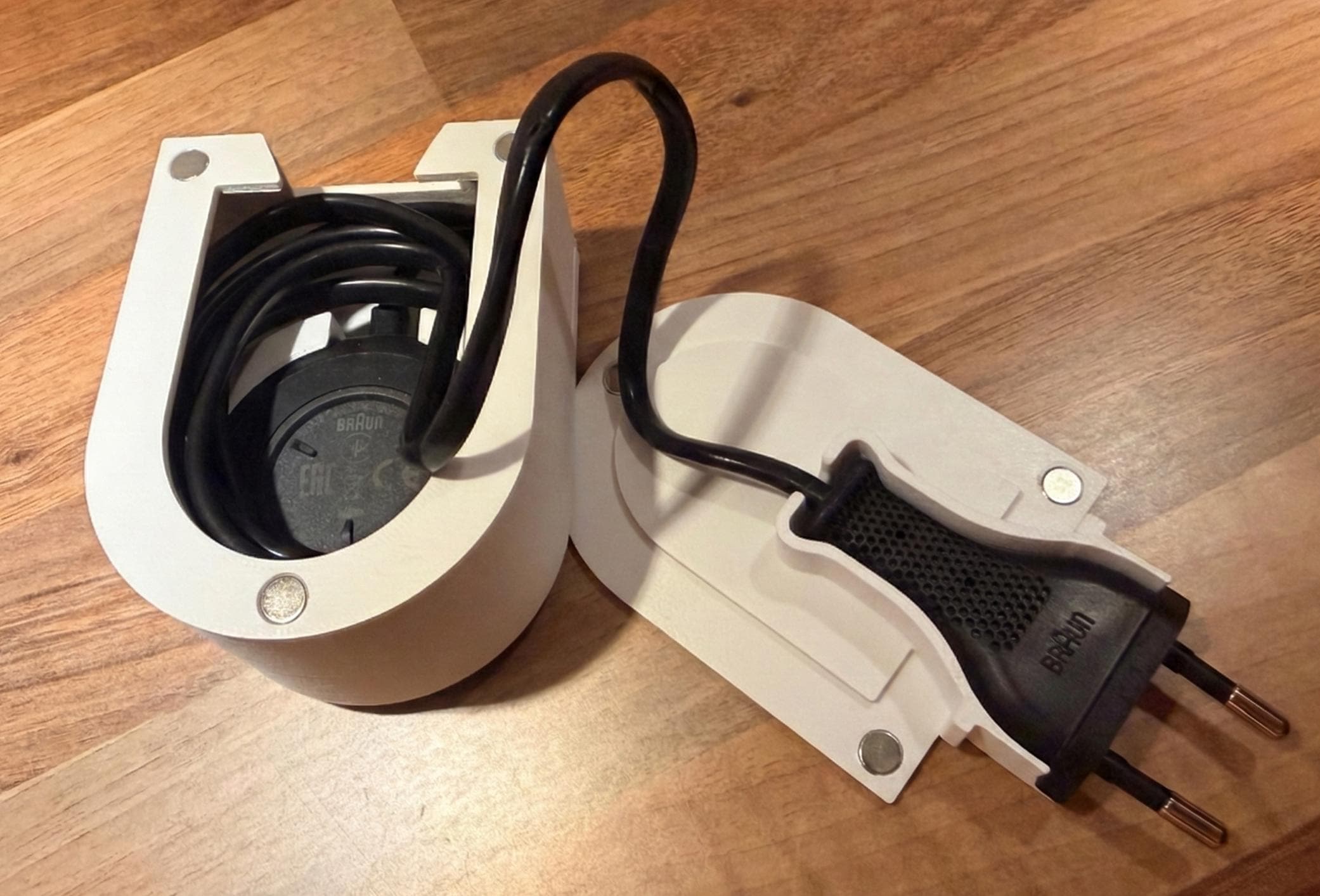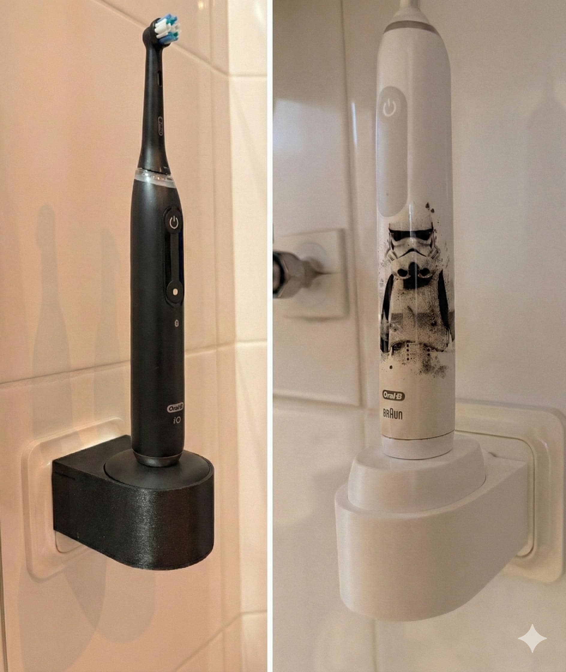 This outlet-mounted holder turns your Oral-B iO charger into a compact charging stand and hides the excess cable inside the holder (manual wrap). Clean setup, no cable spaghetti, and yes, it’s made for those bathrooms where the outlet is placed in the most inconvenient spot possible.